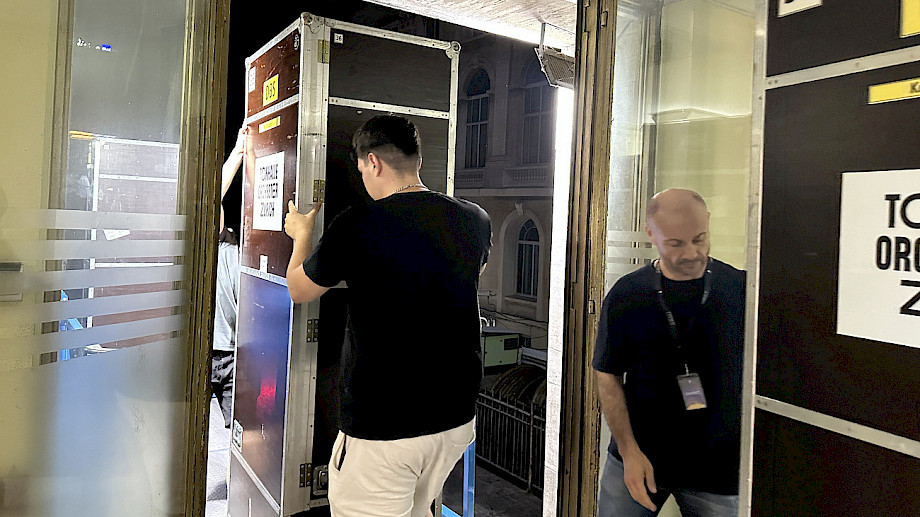 Besonders nach Mahlers 2. Sinfonie bildete sich ein dichter Kreis um Paavo Järvi – Fans mit Blumen und offenen Autogramm-Büchern standen bereit und probierten ihr Glück, manchmal lag auch ein Foto mit unserem Music Director drin. Parallel dazu begannen unsere Bühnentechniker bereits mit dem Einpacken der Instrumente. Der 40-Tönner stand unten schon bereit und wartete auf die Beladung. Den Anfang machten die Kontrabässe. Zurück in ihren riesigen Kisten, wurden sie mit einem speziellen Lift, der bündig zur äusseren Hauswand stand, bis ins Erdgeschoss transportiert. Wenn man nicht wusste, dass unten ein Lift wartete, hätte man meinen können, die Instrumente flögen aus dem Fenster – doch es verlief alles glatt. Sechzig Kubikmeter Instrumentenkisten fanden so den Weg in den Lastwagen.