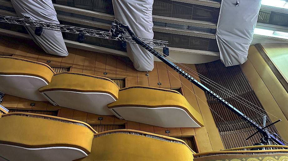 Für die Live-Übertragung wurde ein riesiger Kamera-Schwenkarm eingesetzt. Er war auf einem der Balkone auf der linken Seite stationiert. Während Enescus Prélude zur Oper «Œdipe» am ersten Konzertabend fielen einem die grossen Kameras – auch auf der Bühne waren einige – noch auf, doch danach vergass man sie bald.