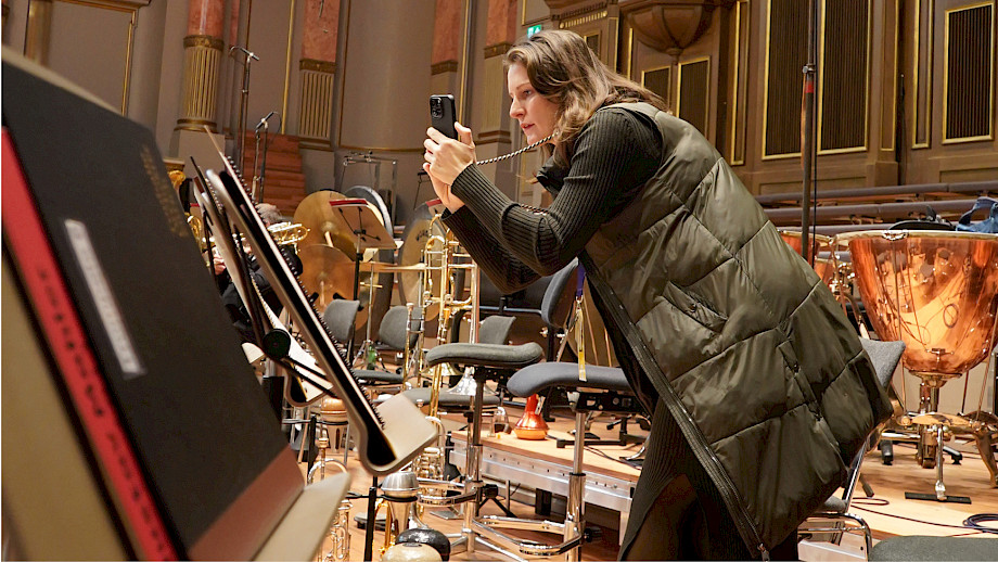 12:20 Erneuter Wechsel in die Tonhalle, Assistant Conductor Julia Kurzydlak stellt sich probehalber vor das Tuch. Doch, das könnte funktionieren.