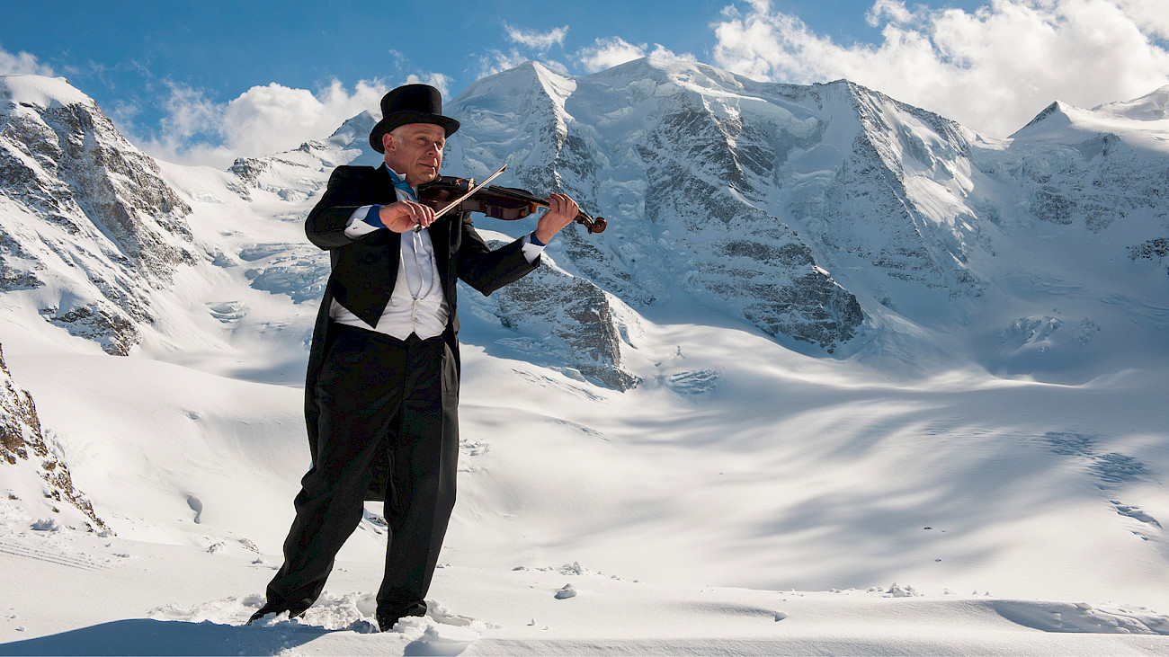 I give outdoor concerts with the Swiss Ice Fiddlers, an ensemble with a variable line-up. And with TangoGlaciar: this consists of myself and a Dutch glaciologist from the MortAlive glacier project, where we are investigating methods for the delayed melting of glaciers. I regularly take part in Harald Haugaard's International Fiddle School in northern Germany with my wife. When we played Nordic folk music on a dyke in Husum a few years ago, I immediately had an image of performing a concert at the foot of Piz Palü. I told the others on the course about our melting glaciers. As a result, 53 participants of the Fiddle School spontaneously agreed to perform the first glacier concert on 13 October 2018 at the place where the Föhn storm swirls in the film "The White Hell of Piz Palü". We all felt the power of music to mobilise people for the endangered glacier world. That was the starting point for my concerts in the mountains. Incidentally, Ursula Sarnthein, the violist of the Tonhalle-Orchester Zürich, has recently started travelling with us. I really enjoy going to her for violin lessons because she is a great role model for me.