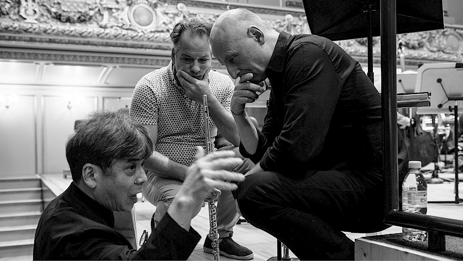 Toshio Hosokawa, Emmanuel Pahud und Paavo Järvi während der Proben zur Saisoneröffnung. (Foto: Alberto Venzago)