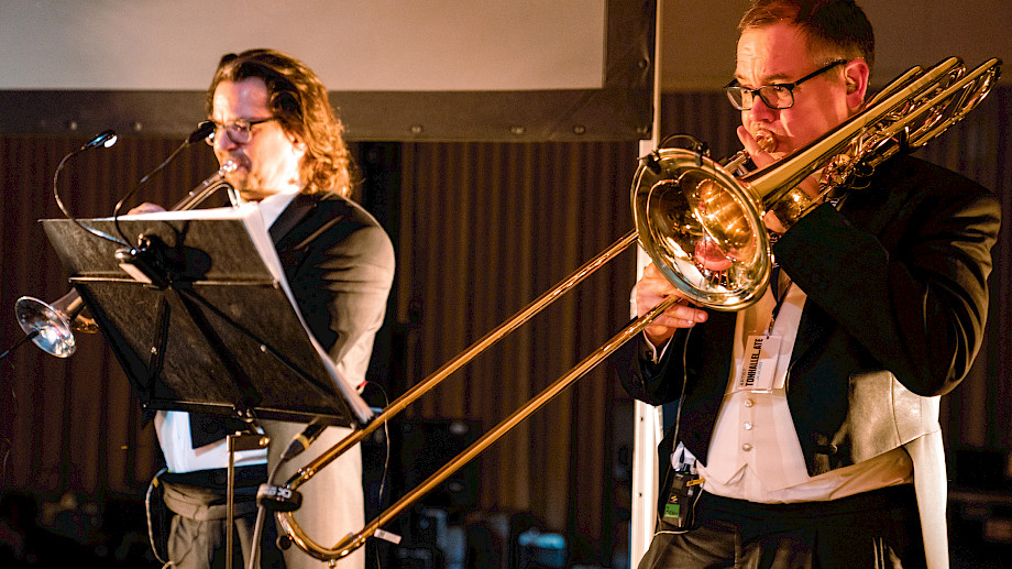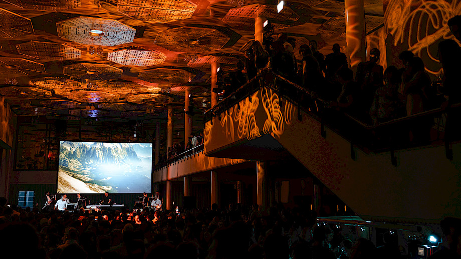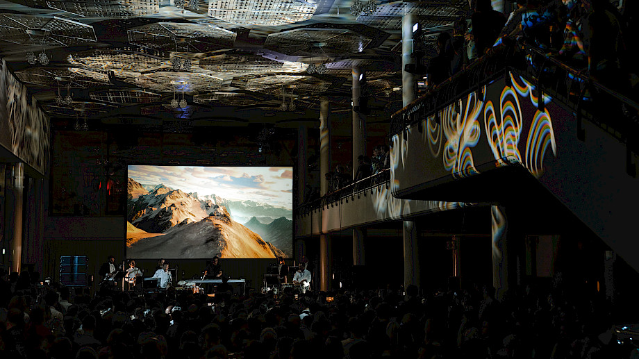 And then it continued with a live act with Petar Dundov, who, together with musicians from the orchestra, transformed the concert foyer into a dance floor, supported by visuals from the Packungsbeilage collective and, as always, with direct reference to the programme in the hall: Up into the mountains and far beyond... After a solo part by Dundov, Reto Ardour finally DJed – and that until deep into the night.