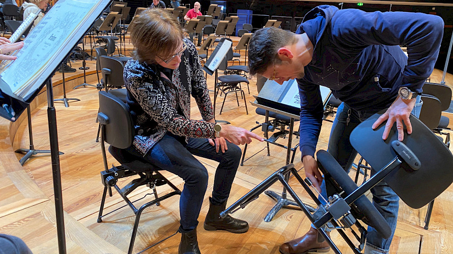 I'm in the backstage area for a while before the dress rehearsal today, which, by the way, definitely gets the title of «best labyrinth of the tour» – you keep losing your bearings because everything looks the same. I take the opportunity to discuss orchestra chairs with Friedemann Dürrschnabel, the head of stage crew, as we will fortunately soon be able to purchase new ones ourselves. In Paris and Luxembourg on stage, we were able to test two models «under real conditions»! Apart from good adjustment possibilities for height, inclination and backrest, it is also important whether they can be stacked well in the confines behind our Zurich stage. Now we know better in which direction to go.