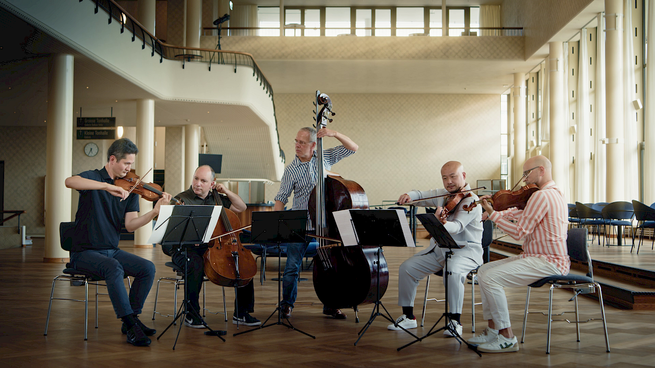 Hören Sie hier einen Ausschnitt von Beethovens Fünfter – gespielt von Andreas Janke, Rafael Rosenfeld, Frank Sanderell, Yu Sun und Enrico Filippo Maligno. Arrangiert von Rafael Rosenfeld.