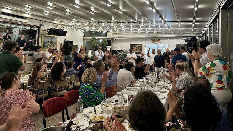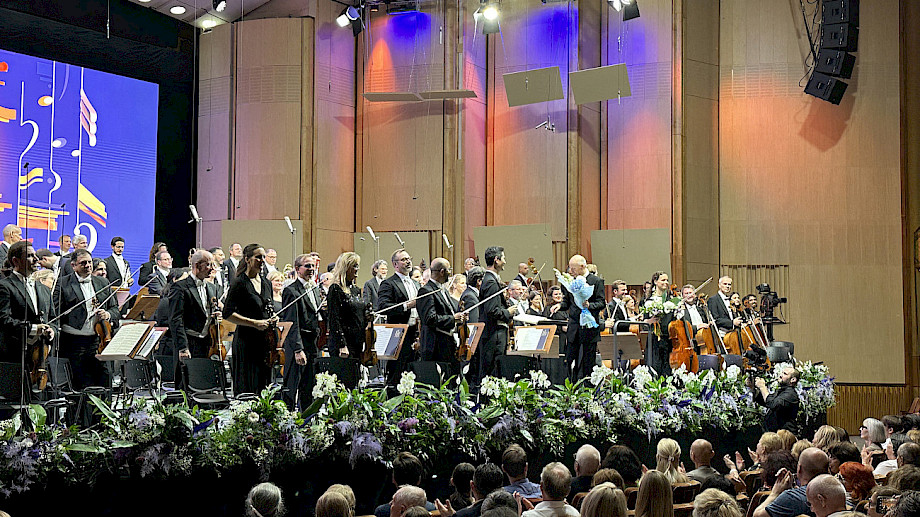 Auch in Sachen Musik ging es traditionell rumänisch zu und her: Im Zentrum der Live-Band war eine fröhliche und sehr virtuose Handorgel, deren Lautstärke den gesamten Raum fast zum Explodieren brachte. Paavo Järvi war so angetan von dieser lebensfrohen Musik, dass er von seinem Platz aufstand und begeistert nach vorne zur Band ging, um mit seiner Handykamera einige dieser Momente festzuhalten. Ebenso gab es spontane Tanzeinlagen von unseren Musiker*innen und durchgehend zujubelnde Rufe für die Live-Band. Kurz gesagt: Ein Knaller, dieser erste Abend in Bukarest.