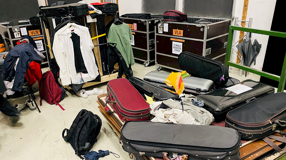 Als wir uns am zweiten Tag zur Morgenprobe für Bruckner 9 auf der engen Bühne zurechtrücken, müssen wir feststellen, dass diese auf der linken Seite mit nun acht Hörnern und unserer vollen Streicherbesetzung überfordert ist. Zwei Bratschen können nicht platziert werden, sie müssen leider draussen bleiben, damit die anderen ihren Bogen durchziehen können.