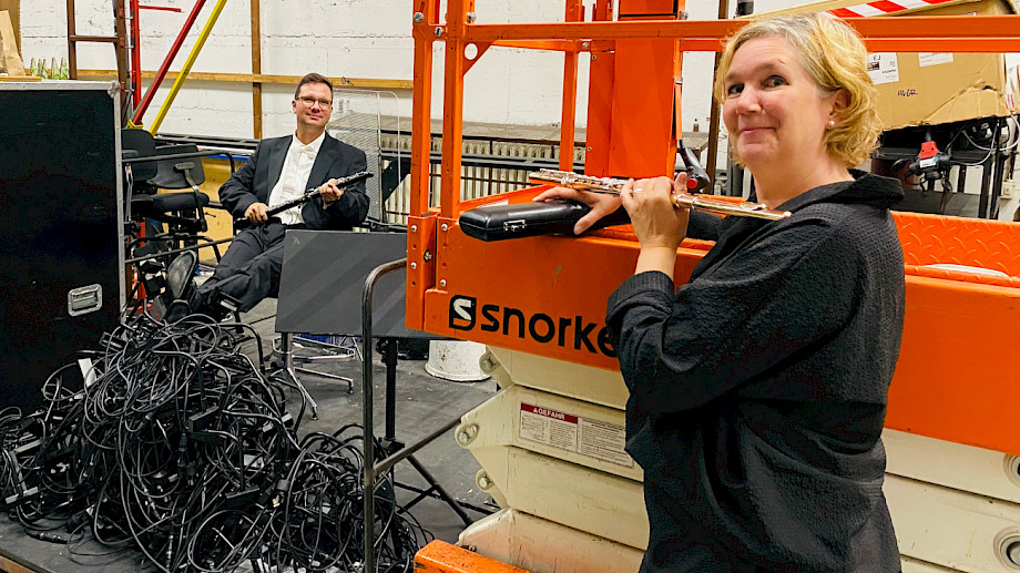 In so einem Opernhaus steht hinter der Bühne viel herum, und dazu kommen jetzt noch unsere unzähligen Container. Zum Auspacken der Instrumenten-Kästen arrangieren wir uns mit dem Platz, den wir finden: zum Beispiel auf einem Hebelift oder auch auf herumstehenden, fahrbaren Podesten. Aus einem unerfindlichen Grund bewegte jemand das Podest, auf dem ein Bratschenkasten lag, so dass dessen Besitzerin kurz vor dem Konzert verzweifelt den neuen Aufenthaltsort ihrer Bratsche suchte …