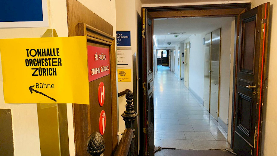Das Rudolfinum verdient ein paar der Superlative dieser Tournee: Es bekommt ganz klar die Auszeichnung für den schönsten Saal. Dazu aber auch jene für die kleinste Bühne, den gedrängtesten Platz hinter der Bühne und den allerlängsten Weg zur Damengarderobe. Wer hätte nach Bonn gedacht, dass das möglich ist! Netterweise haben die Orchestertechniker diesmal gelbe Zettel mit Wegweisern aufgehängt.