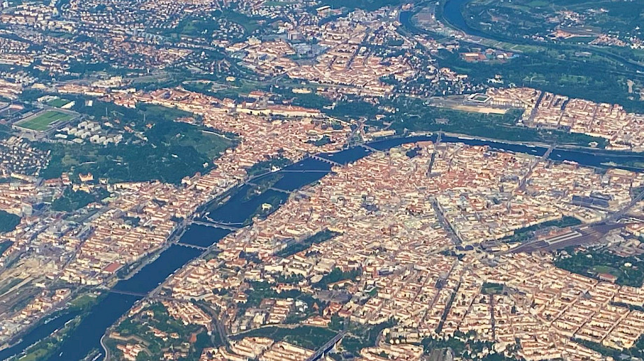 Prag präsentiert sich schon aus der Luft in seiner ganzen Schönheit – vor dem Landeanflug überfliegen wir bei bester Sicht die Stadt und die Moldau (siehe unten). Nun haben wir erst einmal viel Zeit bis zum Konzert am nächsten Abend. Bei dem schönen Wetter hält es wohl nur sehr wenige Musiker*innen im Hotelzimmer. Ich ziehe heute alleine los – aber immer wieder treffe ich in der Stadt auf bekannte Gesichter oder höre ein vertrautes Lachen, und man tauscht sich aus, wo es Spannendes zu sehen gibt oder wo man essen gehen könnte.