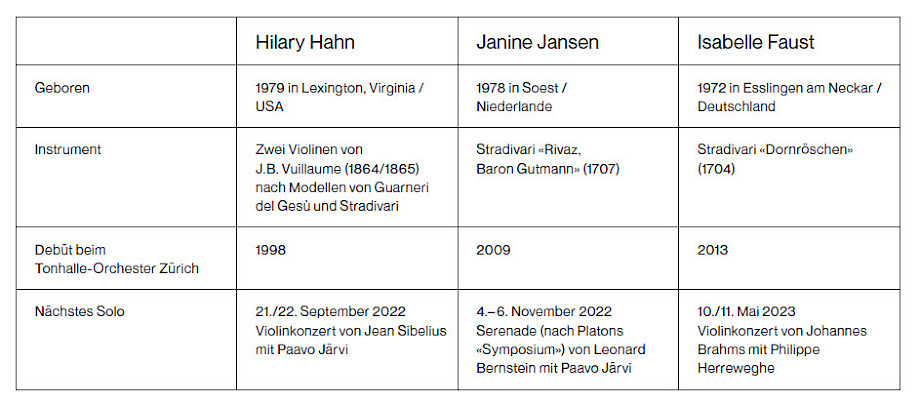 Die Gemeinsamkeiten sind rasch aufgezählt: Hilary Hahn, Janine Jansen und Isabelle Faust stehen alle drei ganz oben auf den Solist*innen-Wunschlisten der internationalen Orchester. Sie sind in den 1970ern geboren und gehören damit zu jener Generation, für die man einst den Begriff der Geigen-Girlies geprägt hat. Und sie machten alle drei schon sehr früh klar, dass dieses Etikett kein bisschen zu ihnen passt.