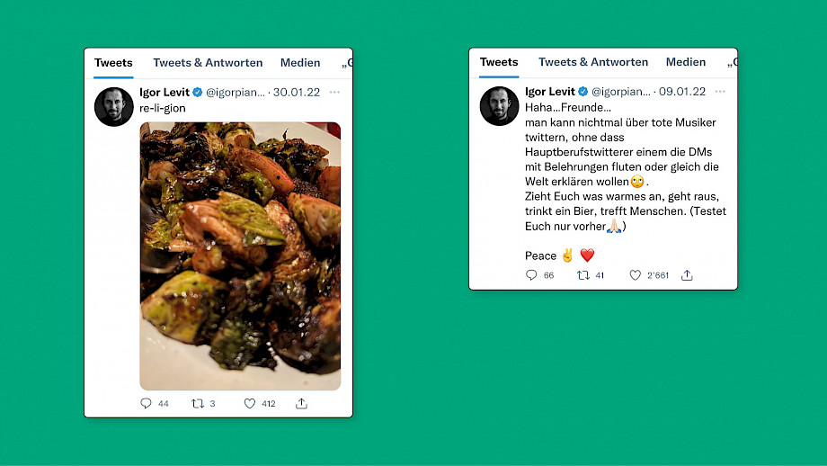Es schwingt eine Freiheit mit in diesen Zeilen von Igor Levit. Er scheint frei zu sein – in seinem Tun, in seinen Äusserungen, frei von Angst. Frei auch in seinen Entscheidungen: Wenn es ihm zwischendrin zuviel wird auf Twitter, taucht er für eine Weile ab.
