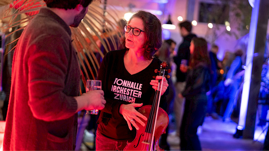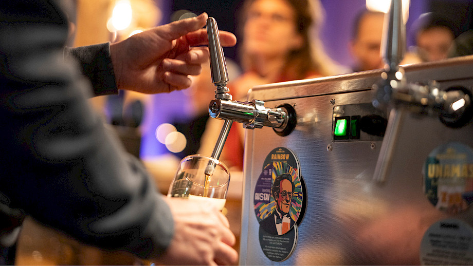 Und dieses Bier hat nun unerwartete Energien freigesetzt. Da waren die Orchestermitglieder Elisabeth Harringer-Pignat, Peter McGuire und Seth Quistad, die als Bierkenner*innen die Mischung nicht nur mitentwickelten, sondern auch mitbrauten. Da war Gianmaria Stelzer, Geigenbauer mit eigener Werkstatt im Gebäude des Bierwerks Züri, der gerade an einer Bratsche für Antonia Siegers-Reid arbeitete und begeistert war von der Idee, Holzspäne als besonderes Ingredienz beizusteuern. Und als das Bier dann auch einen Namen bekam – es heisst Gustav, wegen des aktuellen Mahler-Zyklus des Orchesters – kam auch noch die Grafikerin Kezia Stingelin ins Spiel, die einen schön bunten Bierdeckel entwarf, auf dem sie Mahler kurzerhand ein Bierglas in die Hand drückte. Kurz: Viele Leute hatten so viel Spass an dem Projekt, dass man den Launch gebührend feiern wollten.