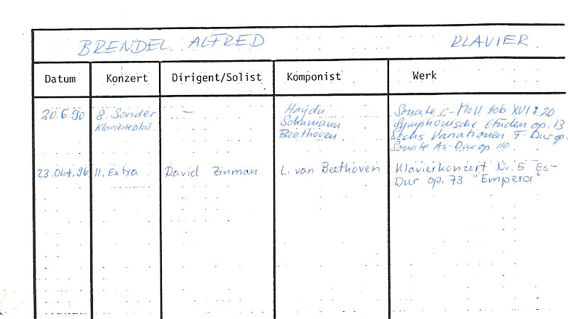 Was das bedeutete, war ab 1962 auch in der Tonhalle Zürich zu erleben. Seinen ersten Auftritt hier, der im Archiv noch handschriftlich dokumentiert wurde, hatte Alfred Brendel unter der Leitung von Hans Rosbaud. Danach folgten sehr sporadische Konzerte, bis 1996 dann die regelmässige Zusammenarbeit mit David Zinman begann.