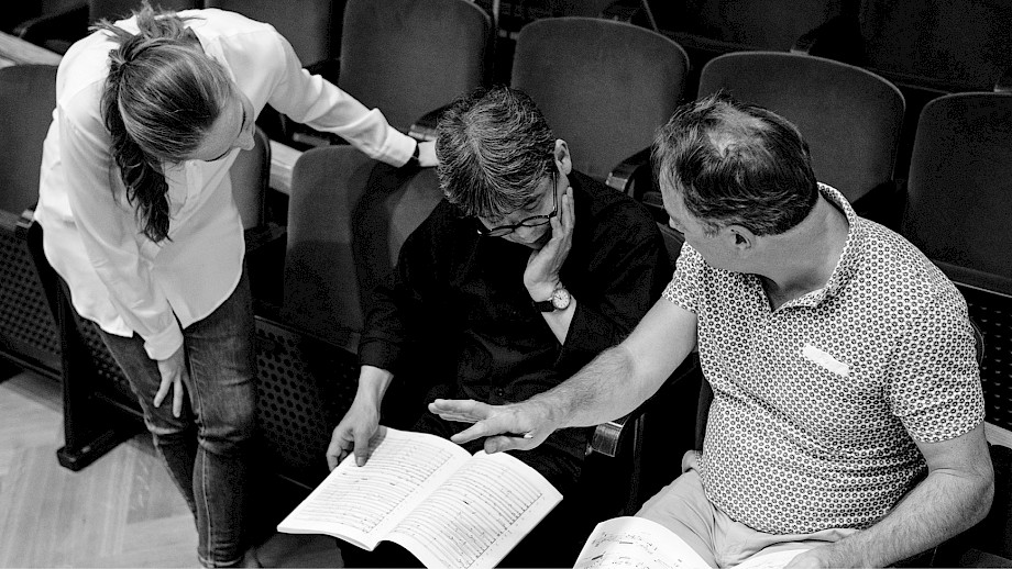 Toshio Hosokawa, Emmanuel Pahud und Paavo Järvi während der Proben zur Saisoneröffnung. (Foto: Alberto Venzago)