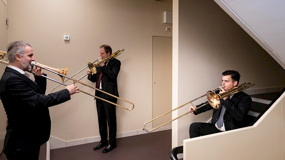 Für das Familienkonzert «Dornröschen» hat die Tonhalle-Gesellschaft Zürich Verstärkung aus dem Opernhaus geholt. Backstage bereiteten sich unsere Musiker*innen neben den Tänzer*innen des Junior Ballett Zürich vor.