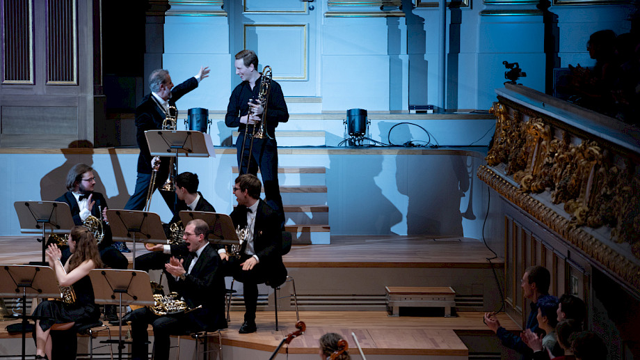 Dirigent David Bruchez-Lalli und Cellist Paul Handschke überraschen mit einer Posaunen-Zugabe. (Foto: Akvilė Šileikaitė)