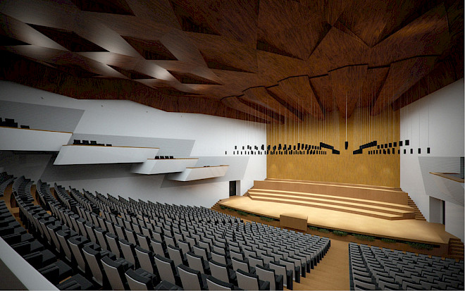 So schlicht das 2011 eröffnete ADDA von aussen wirkt, so spektakulär ist der Konzertsaal im Innern gestaltet: Holz und Kupfer erinnern an das Material von Instrumenten, die Farben Schwarz und Weiss an Klaviertasten.