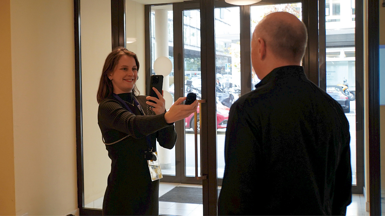 10:52 Kurzer Rundgang durch die Büros mit der Frage, wer diesen «Gray Screen» halten könnte während dem Dreh. Marta Lisik vom Fundraising kann, die Grafikerin Marcela Bradler ebenfalls.